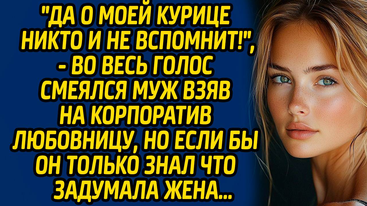 Удивительная история из жизни про Ольгу и её мужа Богдана, который однажды замыслил недоброе.... "Да о моей курице никто и не вспомнит!", - во весь голос смеялся муж взяв на корпоратив любовницу, но если бы он только знал что задумала жена...