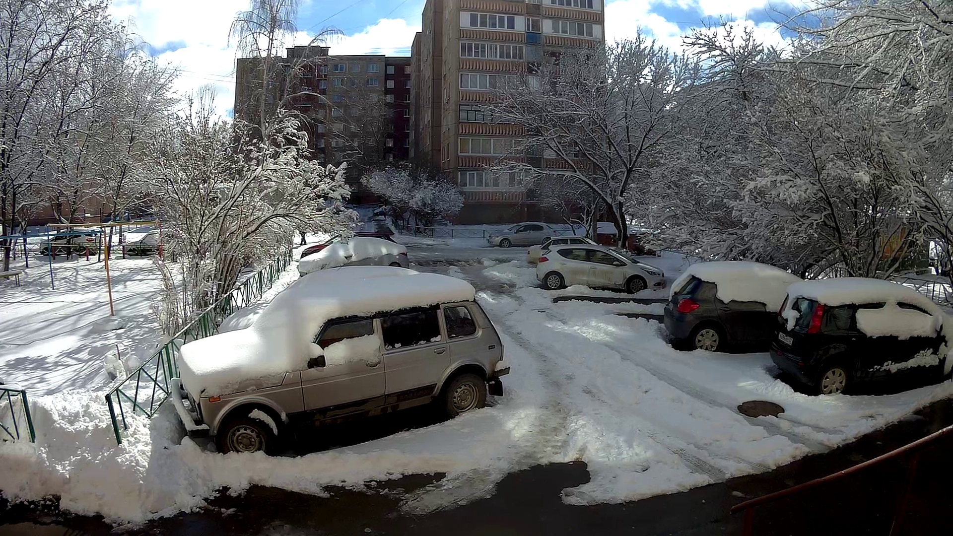 Много снега возле дома. Деревья и машины в снегу