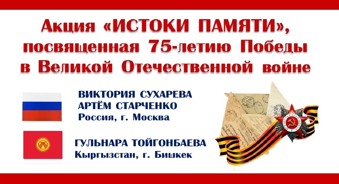 Акция «Истоки памяти» в честь 75-летия Победы. Поздравление от Виктории Сухаревой и Артема Старченко (Россия) и Гульнары Тойгонбаевой (Кыргызстан). Участники, члены жюри и друзья Фестиваля «Истоки» поздравляют всех с Днём Победы! Мы благодарим всех участников акции из разных стран и городов за ваши открытые сердца и добрые слова, за сохранение Памяти! #ДеньПобеды #75летПобеды #БессмертныйПолк #мывместе #фестивальистоки #истокипамяти #истоки #соотечественники Сайт: www.festistoki.ru / www.festistoki.com E-mail: festistoki@mail.ru