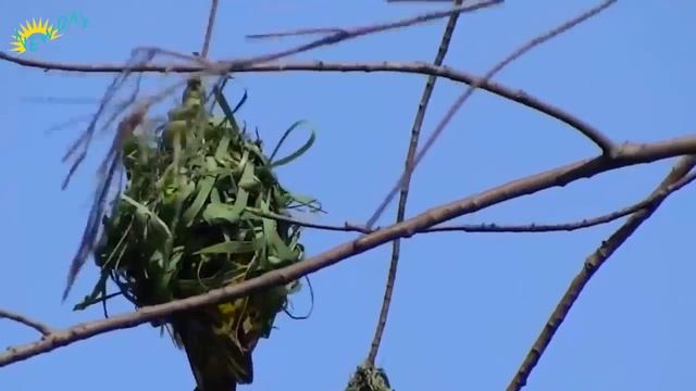 Birds use long grass to build their nest on the branches of the tree