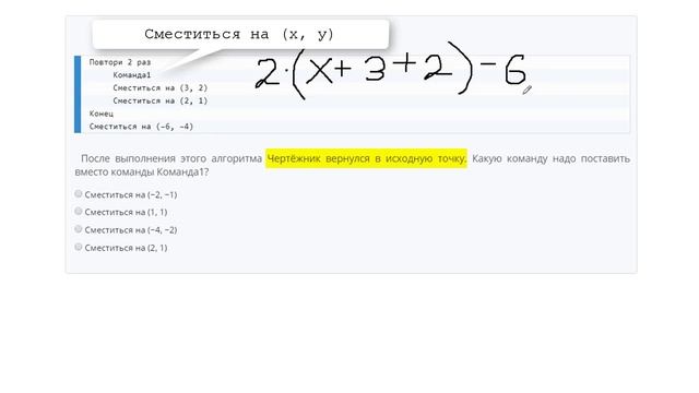 http://egoroffartem.pythonanywhere.com/oge/task/6 На сайте размещены другие задания по этой теме http://egoroffartem.pythonanywhere.com/oge/videotask/6 Список всех разборов 6 задания из ОГЭ по информатике: https://www.egoroffartem.ru/oge/videotask/ Видео решения задач по ОГЭ информатике https://vk.com/egoroff_channel_oge В данном группе можете найти информацию о новых видео и задать вопросы по ОГЭ Информатике Разбор задания № 6 ОГЭ ИНФОРМАТИКА Тема задачи "Выполнение алгоритмов для исполнителей" Чертёжнику был дан для исполнения следующий алгоритм: Повтори 2 раз Команда1 Сместиться на (3, 2) Сместиться на (2, 1) Конец Сместиться на (−6, −4) Copy После выполнения этого алгоритма Чертёжник вернулся в исходную точку. Какую команду надо поставить вместо команды Команда1?