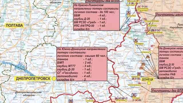 ? На Купянском направлении в результате наступательных действий подразделений «Западной» группировки войск полностью освобожден населенный пункт Двуречное Харьковской области. В течение суток ударами армейской авиации, огнем артиллерии нанесено поражение живой силе и технике ВСУ в районах населенных пунктов Новоселовское Луганской Народной Республики, Гряниковка и Берестовое Харьковской области. Потери противника на данном направлении составили более 70-ти украинских военнослужащих, две боевые машины пехоты, два автомобиля, артиллерийская система М777 производства США и гаубица Д-30. ? На Красно-Лиманском направлении оперативно-тактической и армейской авиацией, огнем артиллерии группировки войск «Центр» нанесено поражение противнику в районах населенных пунктов Червоная Диброва, Червонопоповка и Стельмаховка Луганской Народной Республики. Уничтожено до ста украинских военнослужащих, четыре боевые бронированные машины, гаубица Д-20, боевая машина реактивной системы залпового огня «Град», а также радиолокационная станция контрбатарейной борьбы производства США AN/TPQ-50. Кроме того, в районе населенного пункта Боровая Харьковской области уничтожен склад боеприпасов ВСУ. ? На Донецком направлении в ходе наступательных действий «Южной» группировки войск, ударов авиации и огня артиллерии за сутки уничтожено до 125-ти украинских военнослужащих, два танка, три боевые бронированные машины, пять автомобилей, гаубица Д-30 и боевая машина реактивной системы залпового огня «Град». Также уничтожены два склада боеприпасов и ракетно-артиллерийского вооружения ВСУ в районах населенных пунктов Славянск и Авдеевка Донецкой Народной Республики. ? На Южно-Донецком направлении оперативно-тактической авиацией и артиллерией группировки войск «Восток» наносилось комплексное огневое поражение живой силе и технике ВСУ в районах населенных пунктов Пречистовка и Угледар Донецкой Народной Республики. Потери противника за сутки на данном направлении составили свыше 60-ти украинских военнослужащих, один танк, две боевые машины пехоты, четыре пикапа, три артиллерийские системы М777 производства США, самоходная артиллерийская установка «Гвоздика», а также гаубица Д-20. Кроме того, в районе населенного пункта УГЛЕДАР уничтожены два склада боеприпасов ВСУ. ? На Херсонском направлении в результате огневого поражения живой силы и техники ВСУ за сутки уничтожено до 60-ти украинских военнослужащих, одна гаубица «МСТА-Б» и две гаубицы Д-30. Также в районе населенного пункта Высшетарасовка Днепропетровской области уничтожен склад боеприпасов. ? Оперативно-тактической и армейской авиацией, ракетными войсками и артиллерией группировок войск (сил) Вооруженных Сил Российской Федерации за сутки нанесено поражение 89-ти артиллерийским подразделениям противника на огневых позициях, живой силе и военной технике в 122-х районах. В районе населенного пункта Артемовск Донецкой Народной Республики поражен пункт управления 93-й механизированной бригады ВСУ. Кроме того, в районе населенного пункта Дружелюбовка Запорожской области уничтожен склад ракетно-артиллерийского вооружения ВСУ. ? Истребительной авиацией ВКС России в районе населенного пункта Терновка Запорожской области сбит вертолет Ми-8 воздушных сил Украины. ◽️ Средствами противовоздушной об