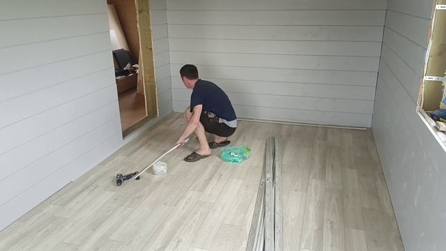Стелю линолеум и креплю плинтуса в деревянном доме.