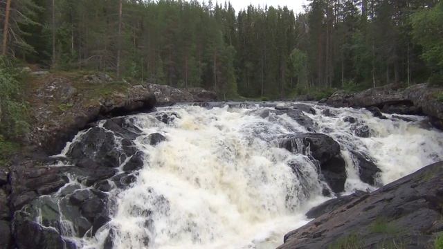 Водопад Куми-порог — самый высокий в Карелии, расположен в красивых безлюдных местах Калевальского района. На сайте vatravel.ru многое о Карелии и других регионах России. Водопад Куми-порог на реке Войница находится в Калевальском районе республики Карелия. Ближайший населенный пункт — маленький посёлок Войница. Больше никакого жилья в этом районе нет, машин и людей тоже почти нет. Поэтому спросить дорогу не у кого, искать водопад придётся самостоятельно. При всей кажущейся простоте маршрута от Войницы мы оказались на водопаде только через два часа, если не больше. Около Войницы есть развилка, надо ехать в сторону Финляндии, на Костомукшу поворачивать не надо. Километров пятнадцать надо ехать прямо, да свернуть там особо некуда. Затем надо повернуть направо на достаточно наезженную грунтовую дорогу. Ориентиром служит металлический вагончик зеленого цвета, который видимо остался от пограничников. Если его уберут, то и ориентиров больше никаких, проехать единственный нужный поворот будет совсем легко. Далее едем только прямо и упираемся в разрушенный мост через реку Войницу. В принципе можно пойти по руслу реки направо и выйти на водопад сверху, но это долго и сложно, придется продираться через лес вдоль берега. Но не все потеряно. Оказывается, совсем рядом есть крепкий мост, около которого стоит знак, что он выдерживает 12 тонн(!). Это, конечно, вряд ли, но любую легковую машину он выдержит точно. Возвращаемся назад, видим развилку и поворачиваем направо. Выезжаем к столбам с колючей проволокой, это и есть граница с Финляндией. Нам она ни к чему, нам нужен Куми-порог. Едем вдоль колючки, проезжаем упомянутый мост, совершаем подъем и едем направо. Движемся прямо, внизу будет хорошее озеро Коко. Едем еще немного, и о чудо! Первый малюсенький указатель на водопад показывает направо. Раньше их было ну никак не повесить! Тут уж никак не проедешь, выезжаем на высокий холм, с которого видно и слышно ревущий водопад. Тут целая туристическая стоянка, правда никого там в столь пригожий летний день не было. Много следов от стоянок и у разрушенного моста, но и там было ни души. Пришлось искать лучший водопад Карелии самим, использую отрывочные сведения из интернета и интуицию. Проехать 250 километров из Кеми и не найти водопада было никак невозможно, и покружив по лесным дорогам, мы его всё-таки нашли! Конечно, для посещения водопада лучше снимать жилье в Калевале, но как вышло, так вышло. Главное всё-таки результат, а не участие. Выручили и белые ночи, время на поиск и нахождение на водопаде было не ограничено. А посмотреть тут есть на что. Во-первых, по пути на водопад встречается много красивых мест на реке Войница, которая очень разнообразна и живописна. Во-вторых, это красивый нетронутый лес, но с приличной дорогой. В-третьих, сам Куми-порог — самый высокий водопад Карелии. Водный поток низвергается с высоты четырнадцать метров. Потрясающий вид открывается с площадки на холме, до которой и можно доехать на машине. Не менее впечатляющий вид, когда забираешься на сам водопад. Он образует самое настоящее лесное озеро, после которого снова мы видим обычное русло реки. Кругом девственный лес, покрытые мхами и лишайниками скалы. Тишину нарушает рёв воды, что только радует. Конечно, это лучший водопад Карелии. Да и скорее всего севера России. Это настоящее чудо п