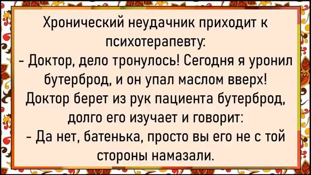 Как кума на кума залезла! Сборник свежих анекдотов! Юмор! 00:00 Утренний диалог • Фатима плачет, муж замечает мокрые усы. 00:09 Шутка над фигурой • Муж неудачно шутит над фигурой жены, она обижается. 00:25 Встреча с ментом • Мужик с похмелья даёт сто рублей менту, который оказывается лифтом. 00:40 Тест для спецслужб • КГБ, ФБР и ЦРУ соревнуются в поимке зайца. ЦРУ не находит зайца, ФБР сжигает лес, КГБ ловит медведя. 01:27 Ошибка на Олимпиаде • Жена ошибочно называет команду из Египта «йогуртом». 02:19 Романтика на море • Жена мечтает о романтике, муж — о лежании на шезлонге. В ресторане муж критикует высокие цены. 02:59 Система штрафов • Бизнесмен вводит систему штрафов за пьянство на складе. 03:28 Размышления о силе и уме • Геракл, Афродита, Зевс и Аристотель обсуждают силу, красоту, молнии и ум. 03:44 Разговор пенсионеров • Один пенсионер жалуется на постоянные боли, другой шутит, что это длится уже десять лет. 03:59 Проход в троллейбусе • Дама пробивается в переполненном троллейбусе, джентльмен советует ей идти боком. 04:21 Психотерапевт и бутерброд • Пациент психотерапевта гордится тем, что бутерброд упал маслом вверх. Доктор объясняет, что пациент намазался не с той стороны. 04:40 Отдых в деревне • Городская семья отдыхает у бабушки, дети жалуются на шум, родители объясняют, что это дедушка храпит, бабушка поперхнулась чаем, а бабушка зовёт деда на помощь. 05:08 Пьяный в лифте • Мужчина в лифте просит «шефа» поднять его на десятый этаж. 05:27 Продажа коровы • Два мужика надувают корову перед продажей, один брезгует после другого. 05:51 Периоды взрослой жизни • Перечисление периодов взрослой жизни: конфетно-букетный, постель-кроватный, рутина
