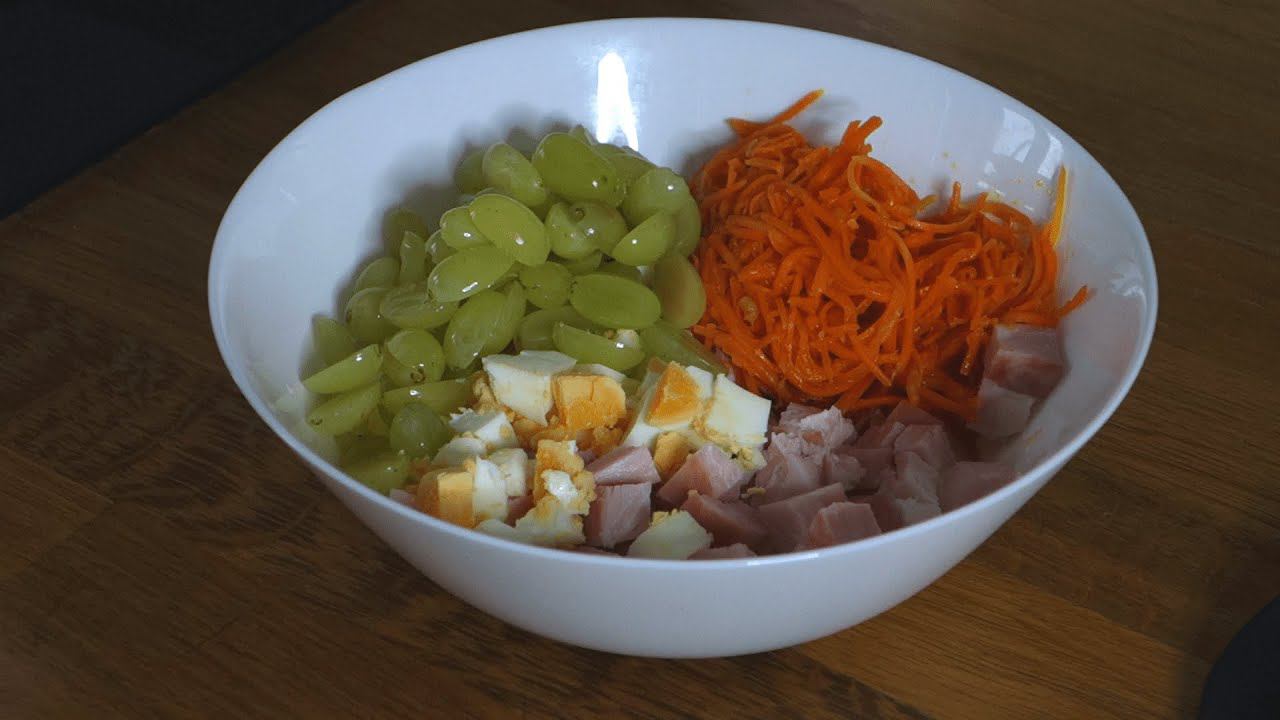 Ветчина или карбонат 200г Морковь по корейски 100г Яйцо 2 шт Виноград б/к 100-150г Майонез по вкусу Можно добавить 1-2 зуб. чеснока *************************************************************************** Мой Дзен https://zen.yandex.ru/id/6136046892718d7919b6717f ************************************************************************************** ☑️ ✍️ Подпишитесь на канал! И поставьте , мне будет приятно —————————————————————— Жмите на колокольчик, чтобы не пропустить новые видео ************************************************************************************** Я в Инстаграм https://www.instagram.com/i.voskresenskaya/ Я в контакте https://vk.com/id35633911 Моя группа в контакте https://vk.com/vanilla_nn ************************************************************************************** Для сотрудничества и рекламы https://vk.com/id35633911 *************************************************************************************** Ивановский текстиль и трикотаж по низким ценам на сайте grandstock.ru https://clck.ru/U8SiW Хотите получить скидку? Воспользуйтесь моим промокодом ZZPIC6GC3 и получите скидку 4% на весь заказ *************************************************************************************** Вы можете начать зарабатывать в Youtube на своих видео. Подключайтесь к партнерской программе. Вам будут платить независимо в какой стране вы живете. Любыми способами: PayPal, Webmoney, деньги на ваш банковский счет и т. д. Просто попробуйте. Вот Ссылка для Подачи Заявки: http://join.air.io/irinasweet ************************************************************************************** #иринавоскресенская