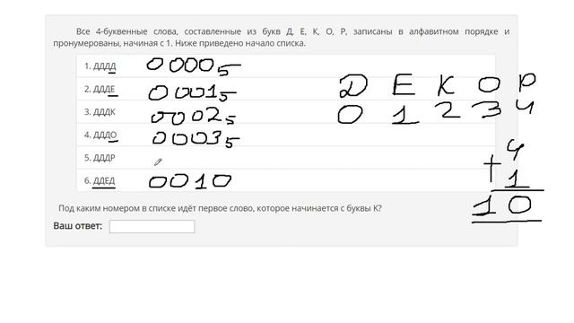 https://vk.com/egoroff_channel В данном группе можете найти информацию о новых видео и задать вопросы http://egoroffartem.pythonanywhere.com/ege/task/10 На сайте размещены другие задания по этой теме Онлайн задания и тесты по другим темам ОГЭ по информатике: http://egoroffartem.pythonanywhere.com/ege/task/ Видео решения задач по ОГЭ информатике: http://egoroffartem.pythonanywhere.com/ege/videotask/ Разбор задания № 10 ЕГЭ ИНФОРМАТИКА Тема задачи "Кодирование, комбинаторика" Все 4-буквенные слова, составленные из букв Д, Е, К, О, Р, записаны в алфавитном порядке и пронумерованы, начиная с 1. Ниже приведено начало списка. ДДДД ДДДЕ ДДДК ДДДО ДДДР ДДЕД Под каким номером в списке идёт первое слово, которое начинается с буквы K?