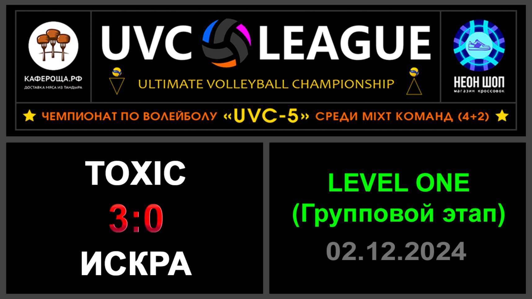 UVC-5 (Mixt): Чемпионат UVC Лиги по волейболу среди MIXT команд (4+2), 2024-2025 гг. Результаты игры: LEVEL ONE (Групповой этап) 02.12.2024 Toxic - Искра 3:0 (25:13, 25:16, 25:22) Конкурс «РЕШАЛА»: ✅Обе команды прошли в следующий этап! Конкурс «Робин Гуд»: ⛔Точных попаданий не было! #UVC_ЛИГА_ЧЕМПИОНАТ_UVC_5_Mixt