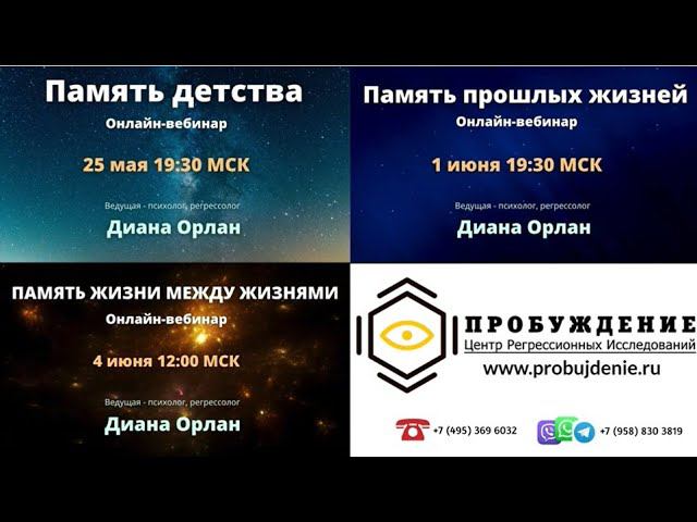 Диана Орлан приглашает на онлайн-вебинары по регрессиям в прошлые жизни. Вебинары будут полезны: регрессологам, психологам, специалистам помогающих профессий, а так же ВСЕМ, кто находится в поиске себя и своего предназначения, ищет свою реализацию и новые направления развития. ✅ С опытным практиком и тренером по регрессиям Дианой Орлан на этих вебинарах Вы: Поймёте, что регрессии — это доступно и полезно; Проявите все недостающие фрагменты и связи; Увидите, на что и как следует обратить внимание в вашем продвижении как в личном развитии, так и в профессиональном; Развеете туманность стереотипов о методе регрессий и работе регрессологов; Пройдёте тематическую трансовую практику и получите обратную связь и рекомендации по вашему опыту; Почувствуете тренера и регрессолога, если присматриваетесь к регрессиям для личного погружения или обучения. Участие без оплатное. Регистрация - по ссылке: https://probujdenie.ru/vebinary-diany-orlan/ До встречи на вебинарах! ______ ✅ Регистрация на избранные вебинары по ссылке: 25 мая 2022 г. 19:30 МСК - Память детства https://online.probujdenie.ru/?r=form&id=26&vc=c116d44bd8d0d41725740f357987852a 1 июня 2022 г. 19:30 МСК - Память прошлых жизней https://online.probujdenie.ru/?r=form&id=27&vc=f3e652d46779102f5f7da7c87a561921 4 июня 2022 г. 12:00 МСК - Память жизни между жизнями https://online.probujdenie.ru/?r=form&id=28&vc=41d1d7f910d22eb11c664d725884733e 28 мая 12:00 МСК ОНЛАЙН - групповая регрессия "Кармические связи" https://online.probujdenie.ru/?r=ordering/cart/as1&id=35&clean=true&lg=ru С 18 июня ОНЛАЙН - обучение регрессиям с Дианой Орлан ✍️ Запись на психологическую консультацию, сеанс регрессии к Диане Орлан https://probujdenie.ru/experts/diana_orlan/ Самоучитель по регрессиям "Я сам" https://probujdenie.ru/diana-orlan-ja-sam/