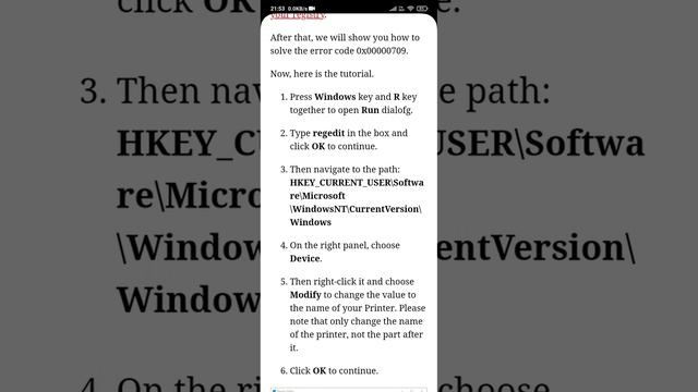 How to fix Operation Could Not be Completed error 0x00000709 In order to fix the error code 0x00000709. you can also choose to modify the registry. But before proceeding, Please take Backup your registry. After that, we will show you how to solve the error code 0x00000709. Press Windows key and R key together to open Run dialofg. Type regedit in the box and click OK to continue. Then navigate to the path: HKEY_CURRENT_USER\Software\Microsoft \WindowsNT\CurrentVersion\Windows On the right panel, choose Device. Then right-click it and choose Modify to change the value to the name of your Printer. Please note that only change the name of the printer, not the part after it. Click OK to continue. Also Right click on Windows click permission Click Add then enter Everyone click ok Click Full Control Check Box Click Apply & ok