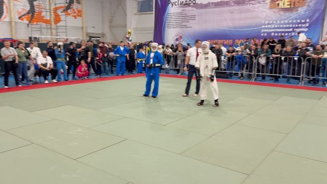 26.01.2025 в Угличе прошло Межрегиональное соревнование по кудо посвященное памяти почетного гражданина Ярославской области Шереметьевой Э.М. Бой в категории 220 ед. 14-15 лет. В синем Ярослав Баранов (г. Москва, СК «Профессионал»), в белом Арсений Ястребов (Ярославская обл.).