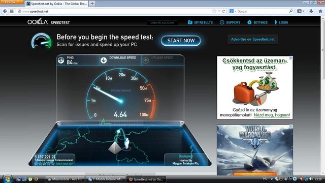 This test took place on 4 April 2014 at 23:17 CEST. I used a T-Mobile Broadband Stick MF667 (ZTE MF667) on Magyar Telekom's HSPA+ network. They have very poor 3G coverage at my place, I am only able to get roughly one bar.