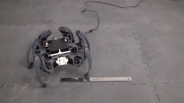 Website: http://www.12centdwarf.com Twitter: https://twitter.com/blegas78 Hexapod robot designed at the Robotics and Neural Systems Laboratory (RNSL) at the University of Arizona. The hexapod is using Robotis AX-12, RX-10, and RX-28 servo motors. The controller is a Fit-PC2 with Intel Atom Z530 Processor computer running Ubuntu 9.04, with a custom PIC18F4550 based USB board to pipe motor control protocol. This is a demonstration of the new leg design which is much more solid than the previous design. Also, new 3D balance gestures have been included based on a spring model. Balance gestures are shown both turned on and off for comparison. The gray plastic was designed in Solidworks, and was created using a Dimension BST 1200es 3D printer. Inverse kinematics is used with a dynamic walking gait. The dynamics still need work to be smoother and faster. The legs are not calibrated perfectly either, which can be seen when a foot occasionally lifts up. Currently the robot has foot contact sensors which will be used in the future for terrain adaptation. Three AX-12 motors will be used to control a camera with 3DOF.