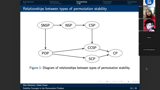 Докладчик: Алексей Семенов, аспирант МФТИ, совместная работа с В. В. Гусевым Тема: Stability concepts in the permutation problem Аннотация: We define a permutation problem, in which every player has a preference regarding their position in the permutation. We want to understand whether there exists an arrangement of players that satisfies everyone. We introduce several types of permutation stability (e.g., Pareto optimum, Nash stability, and consistent stability), explore their relationships, and construct necessary and sufficient conditions for the existence of a stable permutation. Right now, we haven't yet found an interesting practical application for our interesting theoretical results. Most likely, the problem is related to scheduling theory. Any ideas at the talk will be much appreciated!