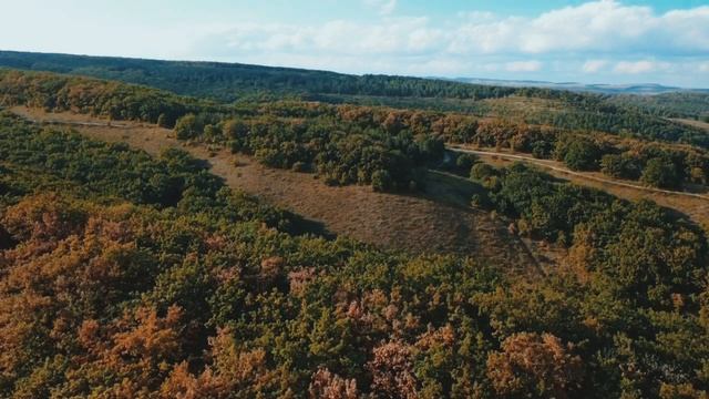 Полет над осеним горным лесом.