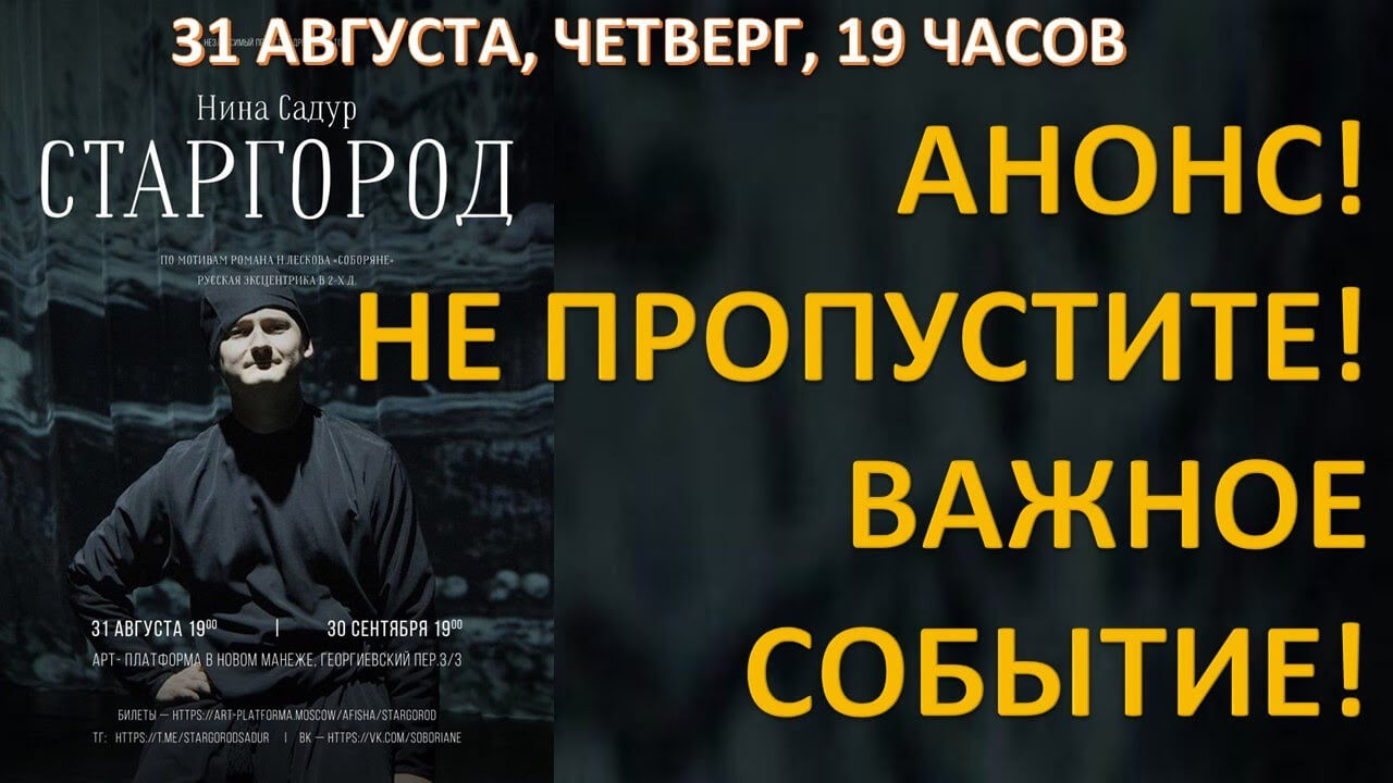 Помощь Школе можно оказать переводом пожертвования на карту: карта МИР 2202 2023 6771 0690 Спектакль Нины Садур "СТАРГОРОД" (по мотивам романа Н.Лескова «Соборяне») пройдёт 31 августа в 19-00 на "Арт-платформе" в Новом Манеже (Георгиевский пер., 3/3, метро "Театральная"). Режиссер спектакля Андрей Леонидович Горбатый. Наше интервью с режиссером Андреем Горбатым можно посмотреть по ссылке. В ролях: Глеб Пускепалис, Валентин Клементьев, Олег Савцов, Юлия Чуракова, Артур Сафиуллин и другие. https://shzs.info/index.php/shzs-information/virtual-studio/2610-naprasnyi-trud-net-tiutchev