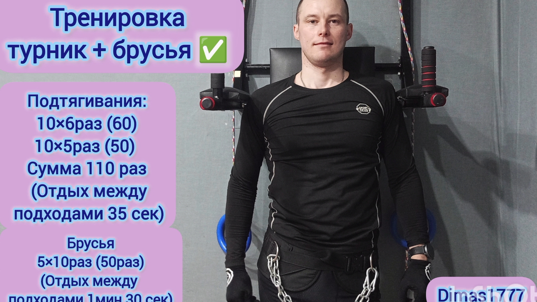 Тренировка на турнике подтягивания аэробным методом 110раз + отжимания на брусьях 5×10 (50раз)