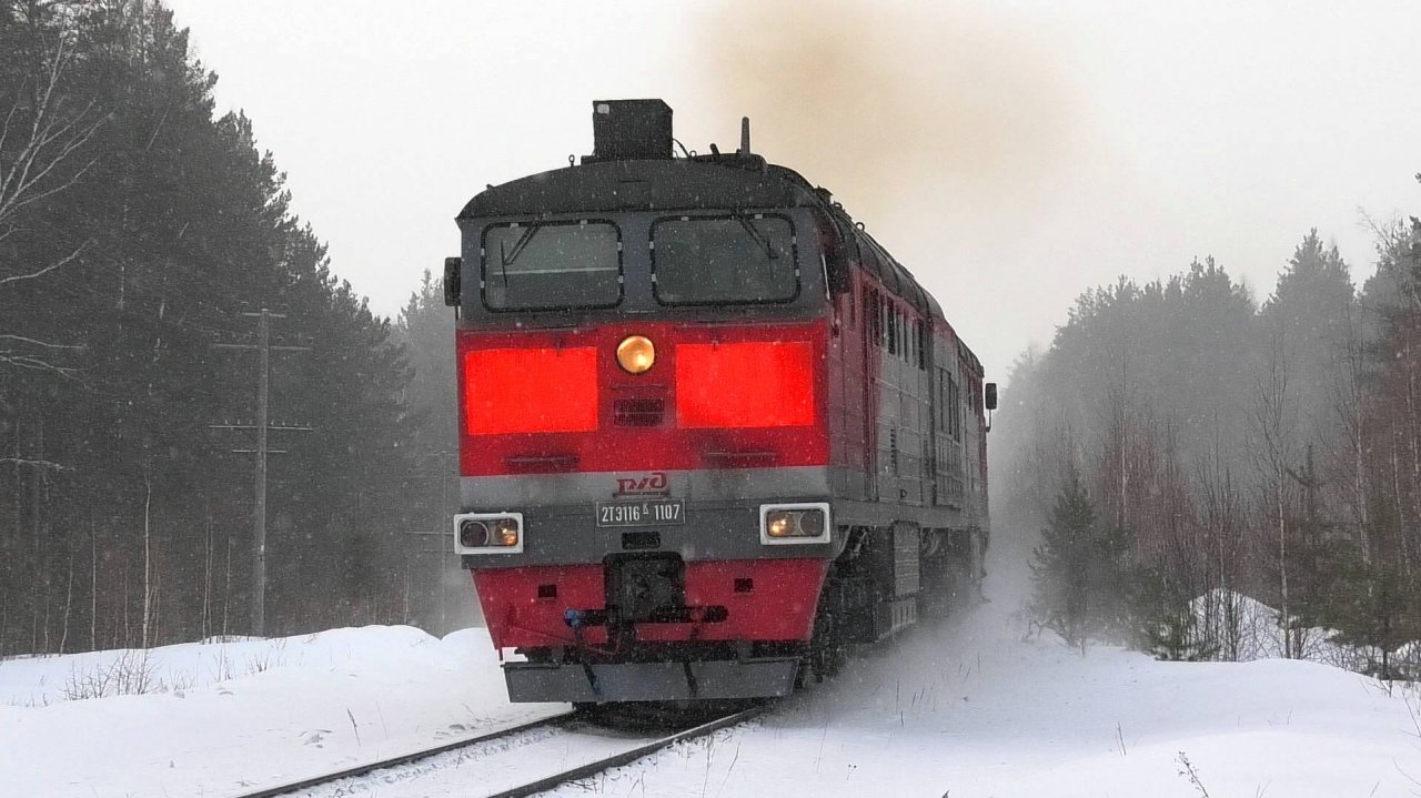 Тепловоз 2ТЭ116К-1107 с контейнерным грузовым поездом следует по перегону Адуй - Костоусово. Свердловская ЖД. Свердловская область, Россия. Приписка: ТЧЭ-13 Егоршино. 18.02.2023