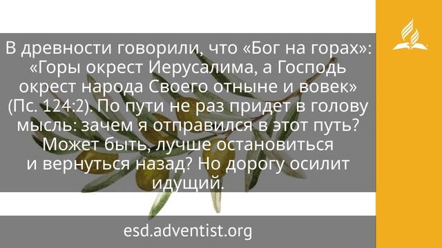 Не даст Он поколебаться ноге твоей, не воздремлет хранящий тебя; не дремлет и не спит хранящий Израиля (Пс. 120:3, 4). Город все ближе и ближе, но путь кажется бесконечно долгим. Дорога проходит через горы Иудейской пустыни. Это самое страшное место, место обитания злых духов. Повсюду камни песчаника, которые под действием ветра принимают причудливые формы, похожие на существ из другого мира. Пустыня — как место соприкосновения двух миров: реального и потустороннего. О Спасителе сказано: «Возведен был Духом в пустыню, для искушения от диавола» (Мф. 4:1). Иудейская пустыня — испытание, через которое паломник проходит на пути в Иерусалим. У кого искать защиты в этом нелегком путешествии? «Возвожу очи мои к горам, откуда придет помощь моя», — горы в то время были то же, что небо для нас сегодня. Мы говорим: «Бог на небе». В древности говорили, что «Бог на горах»: «Горы окрест Иерусалима, а Господь окрест народа Своего отныне и вовек» (Пс. 124:2). По пути не раз придет в голову мысль: зачем я отправился в этот путь? Может быть, лучше остановиться и вернуться назад? Но дорогу осилит идущий. Для того чтобы пройти путь, надо крепко стоять на ногах. Усталость, опасности и искушения не смогут поколебать путешественника на его пути в святой город. И когда было особенно тяжело, паломники поддерживали себя и друг друга словами: «Не даст Он поколебаться ноге твоей». Путешественник вверяет себя в руки Господа как бдительного часового или верного телохранителя. В понимании язычников боги, которые живут на вершинах гор, иногда отвлекаются или засыпают, и этим объясняется их бездействие. Пророк Илия с сарказмом обратился к пророкам Ваала: «Кричите громким голосом, ибо он бог; может быть, он задумался, или занят чем-либо, или в дороге, а может быть, и спит, так он проснется!» (3 Цар. 18:27). Но паломник, путешествующий в Иерусалим для того, чтобы поклониться Всевышнему, уверен: «Не воздремлет хранящий тебя, не дремлет и не спит хранящий Израиля». https://esd.adventist.org/library/periodicals/ezhednevnyie-chteniya/ #адвентисты #АдвентистыСедьмогоДня #Церковь #ЦерковьАдвентистовСедьмогоДня #ЦерковьХристианАдвентистовСедьмогоДня