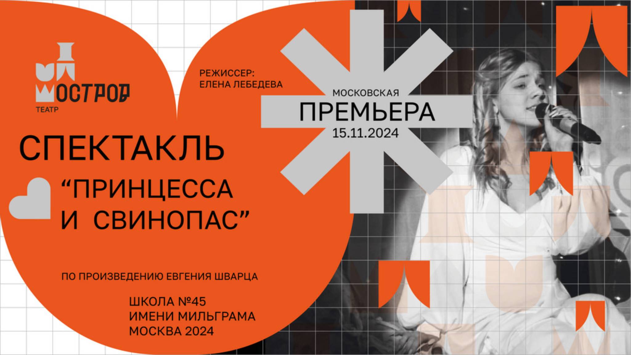 Спектакль «Принцесса и Свинопас» по пьесе Евгения Шварца Детско-юношеская организация «Остров Сокровищ» (https://vostrove.ru), 15 ноября 2024 года, Школа №45 имени Л.И. Мильграма Режиссёр — Елена Лебедева В ролях Принцесса — Софья Морозевич Генрих — Фёдор Шпаков Христиан — Сергей Медведев Волшебный горшок — Ксения Ирбахтина Король-отец — Иван Синельщиков Придворные дамы, Народ, Фрейлины — Агата Стоклицкая, Валерия Арнаут, Анна Казакова, Ольга Климова, Валерия Игнатова , Мария Гапонова Министр нежных чувств — Егор Шибанов Мэр — Василий Тиунов Король-жених — Фёдор Лаврищев Первый министр — Алексей Даценко Камергер — Владимир Янов Поэт — Валерия Игнатова Гувернантка — Варвара Статенкова Камердинер — Кирилл Сафронов Шут — Лев Хунис Свинки — Иван Янов, Мария Балышева, Полина Мишенина, Ульяна Поликарпова, Арина Калинина, Ева Крауз, Александра Арнаут Вокальная группа — Людмила Ротина, Дарья Хорошилова, Агата Стоклицкая Песни Песня придворных дам (Людмила Щербакова — Сергей Щербаков) Хореография — Ольга Климова Песня Волшебного горшка (Людмила Щербакова — Сергей Щербаков) Хореография — Яна Королёва Песня расставания (Людмила Щербакова — Сергей Щербаков) Хореография — Мария Гапонова Дерзкий свинопас (Людмила Щербакова — Сергей Щербаков ) Хореография — Вера Лебедева Грустная песня Волшебного горшка (Людмила Щербакова — Сергей Щербаков) Хореография — Ксения Ирбахтина Сцена в деревушке (Людмила Щербакова — Сергей Щербаков) Хореография — Софья Шпакова Песня Камергера (Александра Тимашкова — Александра Тимашкова) Хореография — Мария Гапонова Мысли Министра нежных чувств (Людмила Щербакова — Сергей Щербаков) Хореография — Яна Королёва Песня Принцессы (Наталья Алейкина — Наталья Алейкина) Застольная (Людмила Щербакова, Мария Лаврищева — Сергей Щербаков, Сергей Медведев) Так я не могу жить без тебя… (Пётр Копылов — Пётр Копылов) Песня фрейлин (Людмила Щербакова — Сергей Щербаков) Хореография — Софья Шпакова Песня Короля (Мария Лаврищева — Алексей Лаврищев) Хореография — Вера Лебедева Ткачи и Поэт (Людмила Щербакова — Сергей Щербаков) Ткачи и Министр нежных чувств (Людмила Щербакова — Сергей Щербаков) Ткачи и Первый министр (Людмила Щербакова — Сергей Щербаков) Это любовь (Людмила Щербакова — Сергей Щербаков) Хореография — Софья Шпакова Опускается тихо вечер… (Людмила Щербакова — Сергей Щербаков) Аранжировка песен — Сергей Щербаков Художник по костюмам — Елизавета Мушегян Сценография — Елена Лебедева Свет — Степан Лушников Звук — Александр Маннин Видео — Виталий Лебедев Труппа благодарит Андрея Маннина и фирму «Еврофлаг» за помощь с декорациями, родителей актёров — за помощь в изготовлении костюмов. https://t.me/ostrov_sokrovisch