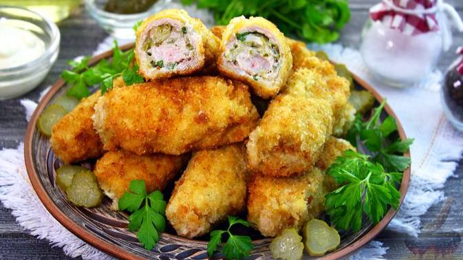 Свиное мясо в хрустящей панировке гармонично сочетается с плавленым сыром и маринованными огурцами, которые добавляют уместную кислинку. #СвинойРулет #РулетыМясные #РулетССыром #РулетСОгурцами #МясоЗапеченное #СвининаЗАпеченная