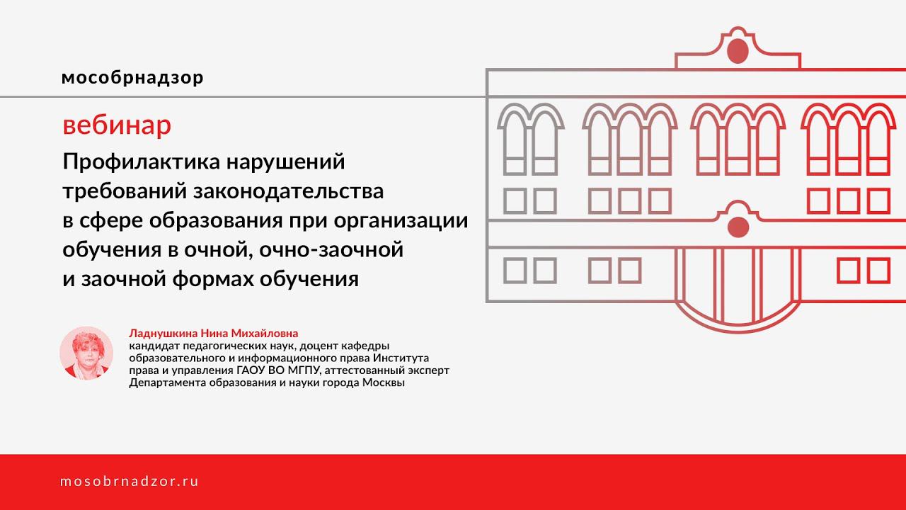 Вебинар «Профилактика нарушений требований законодательства в сфере образования при организации обучения в очной, очно-заочной и заочной формах обучения» был проведен в рамках проекта Мособрнадзор.РФ 29 мая 2020 года. Ведущая вебинара - Ладнушкина Н.М. Страница вебинара на сайте проекта - http://mosobrnadzor.ru/prevention/webinars/2020-05-29_15-00