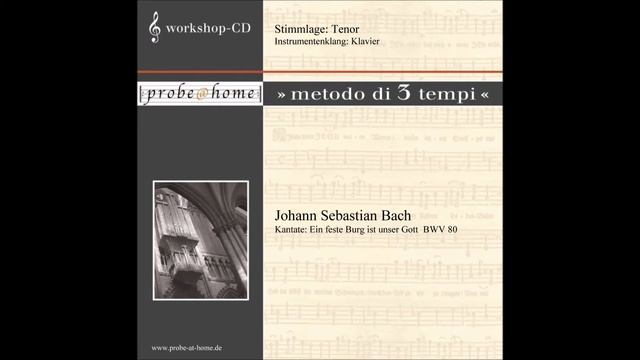 Übungs-Datei für: Ein feste Burg ist unser Gott, bis/till/jusqu'à - Takt/bar/mesure/tempo/compás 119 Nr. 1 from the cantata / aus der Kantate: Ein feste Burg ist unser Gott BWV 80 by/von J.S. Bach Karaoke professional means: No support anymore of the vocal part Tenor. It is completely set to silent. Karaoke professional bedeutet: Der Tenor ist komplett stumm geschaltet. T3 = Tempo 3 = Tempo in performance / Aufführungstempo vocal register / Stimme: minus Tenore / ohne Tenor Klang: Klavier Da der Tenor (nur der Tenor) sofort mit dem Orchester einsetzt, habe ich den Einsetzton und 2 Takte Metronom vorangestellt, damit auch das Tempo sofort aufgenommen werden kann. Ihr findet hier bei YouTube ebenfalls Versionen, in denen jede einzelne Simme hervorgehoben ist. Wahlweise ist die hervorgehobene Stimme als Klavier oder als Streichinstrument hörbar. Desweiteren gibt es eine zusätzliche Karaoke-Version (Karaoke light). Es erklingen die ersten Takte der jeweiligen Stimme. Hinzu kommt noch eine Version ohne Hervorhebung einer Stimme. Das gesamte Werk mit allen Chorsätzen, ist eine Einzel-CD, und kann für jede Stimme erworben werden, bei: https://www.probe-at-home.eu/