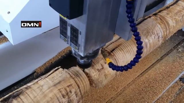 omni cnc router working on column wood material