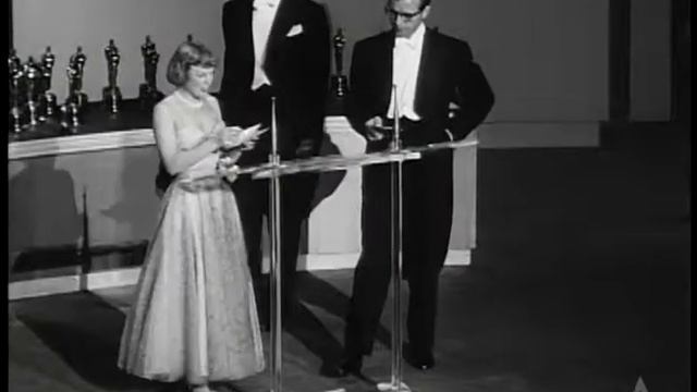 June Allyson and Dick Powell present the Oscar for Cinematography (Black-and-White) to Paul C. Vogel for "Battleground" and the Oscar for Cinematography (Color) to Winton Hoch for "She Wore a Yellow Ribbon" at the 22nd Academy Awards in 1950. Hosted by Paul Douglas.