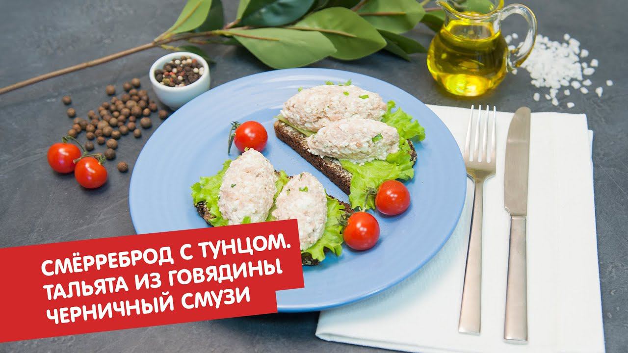 Смёрреброд с тунцом. Тальята из говядины. Черничный смузи с финиками | Первое, второе, третье