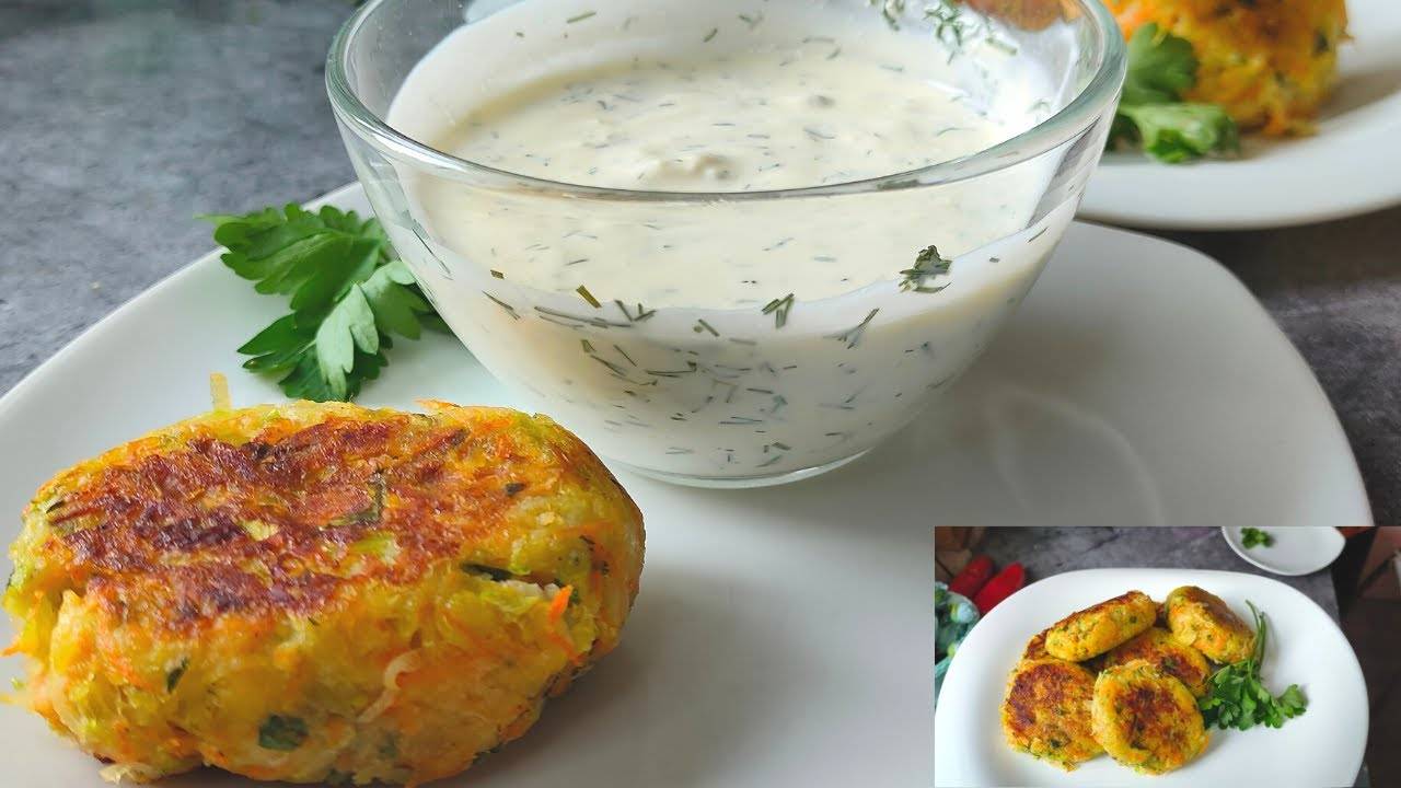 Ингридиенты: 2 шт-кабачки 2шт-картофель 1шт-морковь 2зубчика чеснок 2шт-яйцо 2ст.л.-манная крупа петрушка(любая зелень0 соль и перец по-вкусу Соус: 2ст.л-сметана 2ст.л.-майонез 1зубчик чеснок зелень укропа
