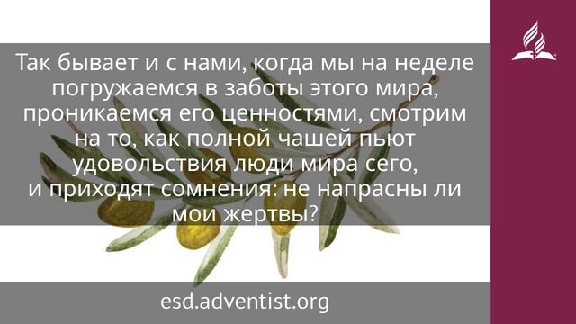 И думал я, как бы уразуметь это, но это трудно было в глазах моих, доколе не вошел я во святилище Божие и не уразумел конца их (Пс. 72:16, 17). Виктор Астафьев, размышляя о жертвах ленинградской блокады, писал: «Миллион жизней — за город, за коробки? Восстановить можно все, вплоть до гвоздя, а жизни не вернешь... А под Ленинградом? Люди предпочитали за камень погубить других людей. И какой мучительной смертью! Детей, стариков...» До сих пор продолжается дискуссия о том, не лучше ли было сдать Ленинград врагу? Может быть, жертвы были напрасны? «И вот, эти нечестивые благоденствуют в веке сем, умножают богатство. Так не напрасно ли я очищал сердце мое?» (стихи 12, 13). Сколько жертв надо принести во имя чистоты сердца? Но мир вокруг говорит: эти жертвы напрасны, ты достоин лучшей жизни, живи легко, как все, и не создавай себе лишних трудностей. Асаф, левит, поэт и музыкант, поставлен на службу перед ковчегом. Ответ на свои сомнения он получил, когда вошел в святилище. Так бывает и с нами, когда мы на неделе погружаемся в заботы этого мира, проникаемся его ценностями, смотрим на то, как полной чашей пьют удовольствия люди мира сего, и приходят сомнения: не напрасны ли мои жертвы? Но по мудрости Своей Творец дал заповедь: шесть дней работай и делай всякие дела твои, а в седьмой день иди во святилище поклониться Богу, привести в порядок мысли, очистить сердце, рассеять сомнения. Что Асаф узнал, войдя во святилище? Ничего нового, просто утвердился в хорошо известной ему истине. Так и мы приходим в церковь утвердиться в истине. Во-первых, благополучие без Бога — это иллюзия. Нет ничего вечного под солнцем, все временно: богатство, положение, сама жизнь — «как сновидение по пробуждении» (стих 20). Во-вторых, никакие временные ценности мира не сравнятся с тем, когда видишь «руку» благодати в своей жизни, Божьи чудеса: «Кто мне на небе? и с Тобою ничего не хочу на земле!» (стих 25). https://esd.adventist.org/library/periodicals/ezhednevnyie-chteniya/ #адвентисты #АдвентистыСедьмогоДня #Церковь #ЦерковьАдвентистовСедьмогоДня #ЦерковьХристианАдвентистовСедьмогоДня