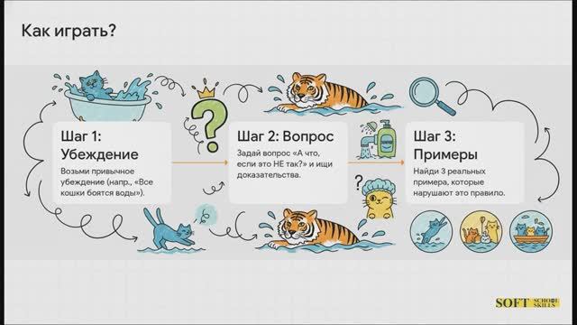 Бесплатный онлайн курс: «Как не "косячить" или аналитика без когнитивных искажений» на платформе Stepik https://stepik.org/244049 Цель курса: помочь тебе перейти от интуитивных (и часто ошибочных) суждений к более объективному, осознанному и обоснованному анализу реальности, минимизируя дорогостоящие ошибки ("косяки"). Дополнительный материал к курсу: в Telegram-канале «Ошибки Шибки» (https://t.me/error_verus), где собраны все известные мне когнитивные искажения с кратким описанием и, что самое важное, практическими контрмерами для борьбы с ними. Шаг 1: Возьми привычное убеждение ("Все кошки боятся воды"). Шаг 2: Задай вопросы: - что, если это НЕ так? (Доказательство: тигры плавают!). - что, если причина не в воде, а в шампуне? - что, если они притворяются, чтобы их не купали? Шаг 3: Найди 3 реальных примера "исключений".