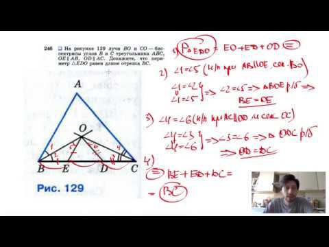 №246. На рисунке 129 лучи ВО и СО— биссектрисы углов B и С треугольника ABC, ОЕ||AB, OD||AC. Докажите, что периметр ΔEDO равен длине отрезка ВС. Поддержать канал рублём - 5469400944002125 (Сбербанк) Мой второй канал для подготовки к ЕГЭ и ОГЭ - https://www.youtube.com/ЕвгенийСумин Инстаграм - https://www.instagram.com/EGE_OGE.math Личный инстаграм - https://www.instagram.com/ee_sumin VK - https://vk.com/evgeniysumin FB - https://www.facebook.com/EvgeniySumin