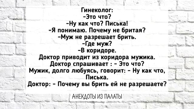 Отличная Подборка Анекдотов! Лучшие Весёлые АНЕКДОТЫ для Настроения! Выпуск 5 00:00 Жена и муж • Жена просыпается и не находит мужа. • Выходит на балкон и спрашивает соседку Машу о своём «сифилитике». • Маша падает в обморок, а муж выходит и объясняет, что он филателист. 00:22 Пропажа тёщи • У авторитета пропадает тёща, братва её ищет. • Через три дня сообщают, что нашли тёщу, но она утонула в озере. • Хорошая новость: Паша собрал два ведра раков, когда вытаскивал её. 00:55 Гинеколог и пациент • Гинеколог спрашивает пациентку, почему она не бреет волосы. • Пациентка отвечает, что муж не разрешает. • Доктор приводит другого мужчину, который не возражает против бритья. 01:32 Снотворные свечи • Доктор спрашивает пациента о новых снотворных свечах. • Пациент отвечает, что свечи замечательные, но он не успевает вытаскивать палец. 01:46 Разговор о поцелуе • Сын рассказывает о поцелуе математички с физруком. • Отец удивляется, что сын рассказал об этом. • Сын объясняет, что математичка сама попросила его об этом. 02:06 Кормление ребёнка • Мужчина пишет матери о рождении сына и отсутствии молока у жены. • Мать шутит, что ребёнка кормила корова, но рога выросли только у одного из сыновей.