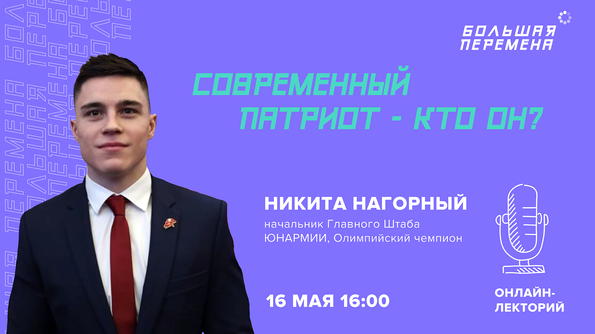 Современный патриот – кто он? Чем он должен заниматься? Какими качествами обладать? Попробуем ответить на эти вопросы вместе с начальником Главного Штаба ЮНАРМИИ, Олимпийским чемпионом Никитой Нагорным. Он станет гостем нашего прямого эфира 16 мая, в 17:00. У тебя есть уникальная возможность задать любой вопрос лично Олимпийскому чемпиону и получить на него ответ. Ждем тебя в комментах и на стриме. Не забывай ставить лайки – спикеру будет приятно! #БольшаяПеремена #Помни #СлужиОтечеству