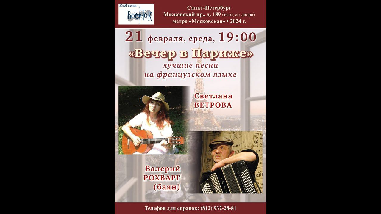 Светлана Ветрова и Валерий Рохварг. «Вечер в Париже». Лучшие песни на французском языке. Клуб песни «Восток». 21 февраля 2024 г. Санкт-Петербург, Московский пр., д. 189. Видеозапись - Алла Левитан. Запись звука - Геннадий Демин. Обработка звука - Николай Алфёров. Афиша - Елена Адрианова.