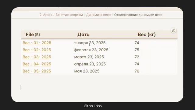 Как отслеживать свой прогресс в Obsidian, как вести базу своих книг с функцией поиска и категорий, как измерять динамику роста и веса — в этом выпуске. 📄 Полный гайд с техническим описанием и кодом вас ждет на моем сайте — ссылка на статью будет в моем Telegram-канале — https://t.me/eltonlabs/168 Друзья, в этом ролике я показал — простые кейсы для понимания работы с YAML. Вы можете взять за основу любой из них — обратится к ChatGPT (или к другим ИИ) — апгрейднуть по своему. А еще вы можете вступить в наш чат по Obsidian'у, где ребята делятся своими вариантами визуализации в Obsidian — https://t.me/eltonlabs Тайм-коды: 0:00 — YAML в Obsidian 0:55 — Что это такое 2:17 — Почему я не использую YAML везде 3:47 — Кейс №1: динамика веса 5:10 — Кейс №2: библиотека 6:36 — Кейс №3: сериалы 7:12 — Кейс №4: трекинг привычек 8:04 — Notion-like таблица 8:28 — Алгоритм работы с YAML 8:44 — Резюмируем Друзья, на канале выходят ролики не только про Obsidian, но и про нейросети и ноу-код инструменты — присоединяйтесь, будет весело! Моя цель — помочь вам выстроить систему, где знания, идеи и действия собираются в единое целое — а рутина автоматизируется Поддержите автора — https://boosty.to/elton_labs/donate Хештеги: #obsidian #графики #визуализация #прогресс #саморазвитие #продуктивность #заметки #рост #chatgpt #привычка #библиотека #динамикавеса #ежедневныепривычки #ежедневный #yaml #coding #способы
