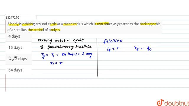 A body is orbiting around earth at a mean radius which is two times as greater as the parking orbit of a satellite, the period of body is