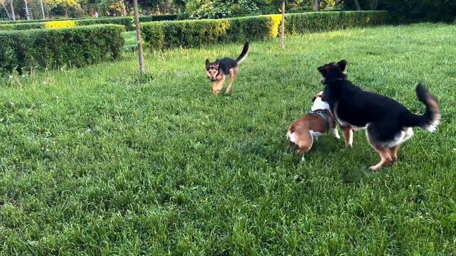 Бульдоги и овчарки играют вместе