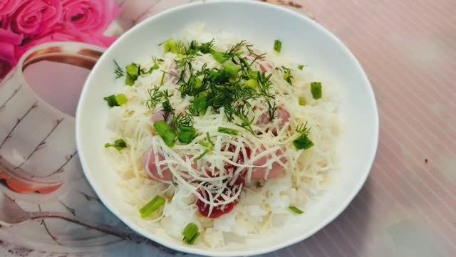 Рис с сосисками и сыром.