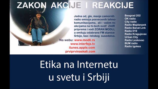 Odlomak iz radijske emisije Zorana Modlija "ZAIR - Zakon akcije i reakcije", od 23. januara 2016, u kojoj je, u okviru rubrike "Tema bez problema", predstavljen autorski tekst Lazara Boškovića "Etika na Internetu u svetu i Srbiji". Hvala radijskoj legendi! Celu emisiju možete da čujete na: http://www.modli.rs/zair/zair2016/Zair_2016.html Izvorni tekst možete da pročitate na: https://agitprop.rs/etika-na-internetu-u-svetu-i-srbiji/ #internet #agitprop
