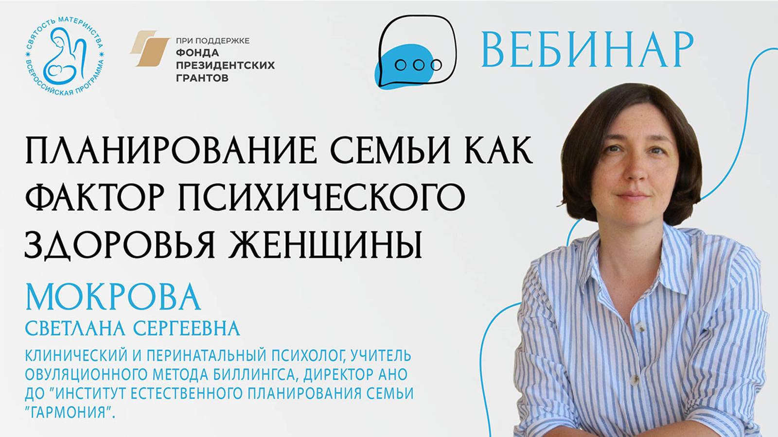 #счастьематеринства #женскоездоровье #психология #ПрезидентскиеГранты #ФондПрезидентскихГрантов Ведущий: Мокрова Светлана Сергеевна – клинический и перинатальный психолог, учитель овуляционного метода Биллингса, директор АНО ДО "Институт естественного планирования семьи "Гармония". На лекции будут рассмотрены следующие вопросы: 1. Обзор методов контрацепции и их механизмов действия с точки зрения влияния на психологическое состояние женщины; 2. Как выбор метода планирования семьи может изменить качество отношений супругов; 3. Современные методы распознавания плодности как здоровьесберегающая и безопасная альтернатива контрацептивным средствам; 4. Овуляционный метод Биллингса как инструмент развития телесной осознанности.
