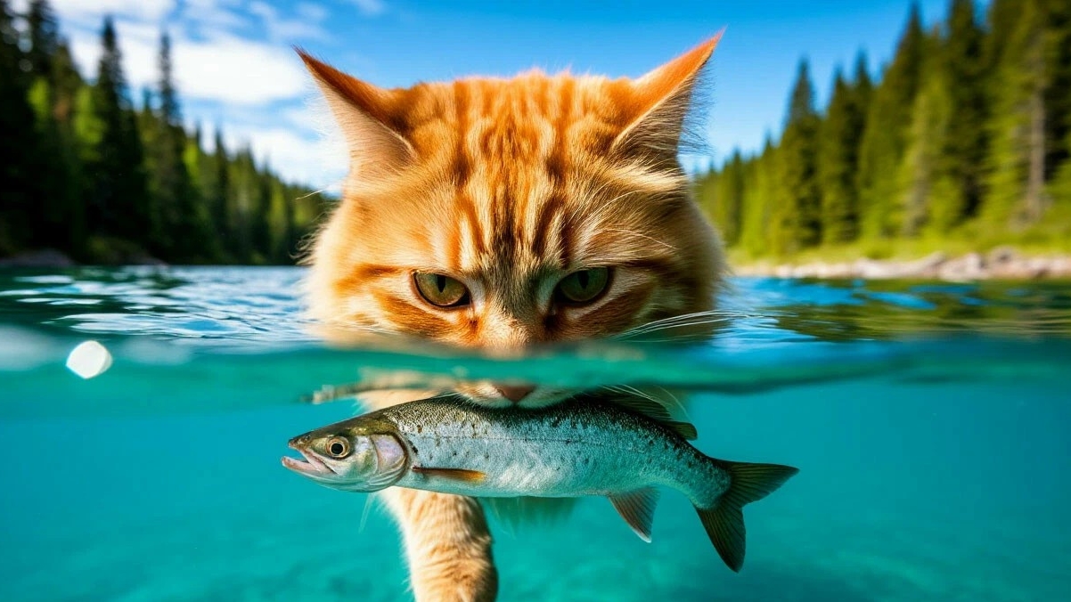 Классное видео о рыжем коте - 328 выпуск : охота кота за рыбой в озере.