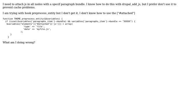 Drupal: How to add javascript with #attached in a node which contains a specific paragraph bundle? Helpful? Please support me on Patreon: https://www.patreon.com/roelvandepaar With thanks & praise to God, and with thanks to the many people who have made this project possible! | Content (except music & images) licensed under CC BY-SA https://meta.stackexchange.com/help/licensing | Music: https://www.bensound.com/licensing | Images: https://stocksnap.io/license & others | With thanks to user SilviaGDLR (drupal.stackexchange.com/users/90264), user JImmy (drupal.stackexchange.com/users/91079), and the Stack Exchange Network (drupal.stackexchange.com/questions/274128). Trademarks are property of their respective owners. Disclaimer: All information is provided "AS IS" without warranty of any kind. You are responsible for your own actions. Please contact me if anything is amiss at Roel D.OT VandePaar A.T gmail.com