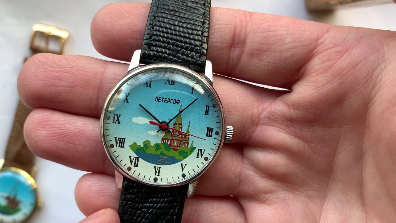 Видеообзор на редкие часы «Ракета» с изображением собора Петра и Павла в Петергофе Петродворцового Часового Завода.
