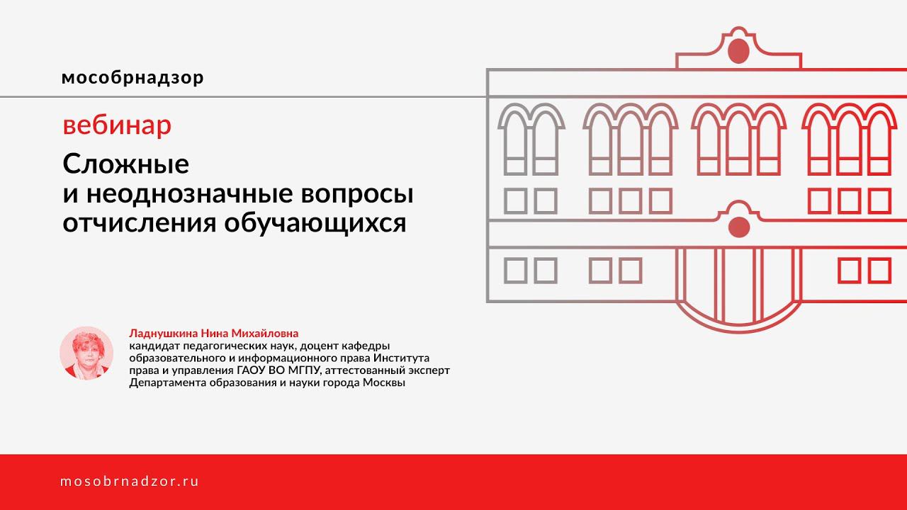 Вебинар «Сложные и неоднозначные вопросы отчисления обучающихся» был проведен в рамках проекта Мособрнадзор.РФ 21 мая 2020 года. Ведущая вебинара - Ладнушкина Н.М. Страница вебинара на сайте проекта - http://mosobrnadzor.ru/supervision/webinars/2020-05-21_16-30