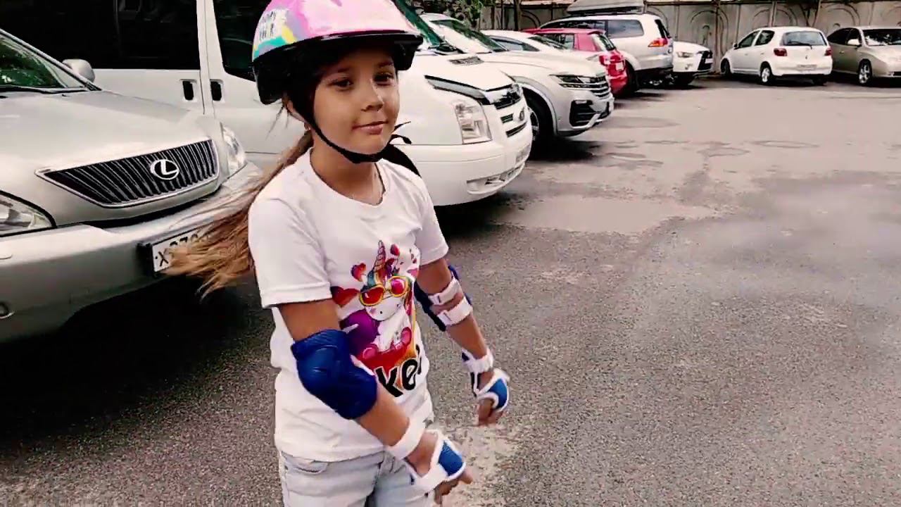 Алина первый раз в жизни встала на ролики.