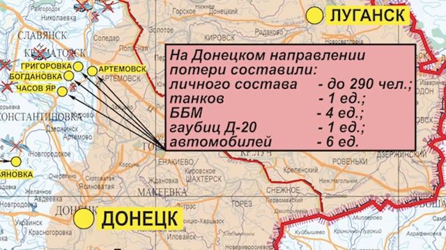 Специальная Военная Операция России на территории Украины Сводки, карты, обстановка на фронте: https://vk.com/newzov ----------------------- ◽️ На Купянском направлении ударами авиации и огнем артиллерии «Западной» группировки войск нанесено поражение подразделениям противника в районах населенных пунктов Новоселовское, Стельмаховка Луганской народной республики, Новомлынск, Тимковка и Каменка Харьковской области. В районах населенных пунктов Синьковка и Берестовое Харьковской области пресечены действия двух украинских диверсионно-разведывательных групп. ? За сутки на данном направлении уничтожено до 60-ти украинских военнослужащих, две боевые бронированные машины, три автомобиля, гаубица Д-20, а также самоходная артиллерийская установка «Гвоздика». Кроме того, в районе населенного пункта Кисловка Харьковской области уничтожен склад боеприпасов 14-й механизированной бригады ВСУ. ◽️ На Красно-Лиманском направлении оперативно-тактической и армейской авиацией, огнем артиллерии группировки войск «Центр» нанесено поражение живой силе и технике ВСУ в районах населенных пунктов Червоная Диброва, Невское Луганской народной республики, Серебрянка и Григоровка Донецкой народной республики. ? Уничтожено до 65-ти украинских военнослужащих, две боевые бронированные машины, два автомобиля, а также две гаубицы Д-20. В районе населенного пункта Григоровка Донецкой народной республики поражен склад боеприпасов 81-й аэромобильной бригады ВСУ. ◽️ На Донецком направлении штурмовые отряды вели бои в западной части города Артемовск. За прошедшие сутки в данном районе российской авиацией совершено семь самолетовылетов. Артиллерией группировки выполнены 74 огневые задачи. ? Ударами оперативно-тактической и армейской авиации, огнем артиллерии и тяжелых огнеметных систем «Южной» группировки войск нанесено поражение подразделениям противника в районах населенных пунктов Часов Яр, Богдановка и Григоровка Донецкой народной республики. Воздушно-десантные войска выполняли задачи по сковыванию подразделений ВСУ на флангах штурмовых отрядов. ? За прошедшие сутки на данном направлении уничтожено до 290 украинских военнослужащих и иностранных наемников, один танк, четыре боевые бронированные машины, шесть автомобилей, а также гаубица Д-20. ◽️ На Южно-Донецком и Запорожском направлениях ударами авиации и огнем артиллерии группировки войск «Восток» нанесено поражение подразделениям ВСУ в районах населенных пунктов Угледар Донецкой народной республики, Темировка, Гуляйполе и Орехов Запорожской области. ? Потери противника составили свыше 50-ти украинских военнослужащих, две боевые бронированные машины, четыре автомобиля, а также гаубица Д-30. ◽️ На Херсонском направлении в результате огневого поражения за сутки уничтожено до 30-ти украинских военнослужащих и три автомобиля. Кроме того, в районе населенного пункта Антоновка Херсонской области уничтожен склад боеприпасов 124-й бригады территориальной обороны. ? Оперативно-тактической и армейской авиацией, ракетными войсками и артиллерией группировок войск Вооруженных Сил Российской Федерации за сутки поражены 92 артиллерийских подразделения ВСУ на огневых позициях, живая сила и техника в 124-х районах. ? Средствами противовоздушной обороны уничтожено три самолета воздушных сил Украины. Два украински