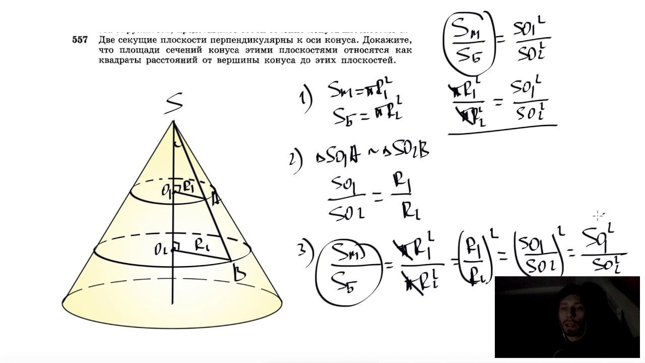 №557. Две секущие плоскости перпендикулярны к оси конуса. Докажите, что площади сечений конуса этими плоскостями относятся как квадраты расстояний от вершины конуса до этих плоскостей. Поддержать канал рублём - 5469400944002125 (Сбербанк) Мой второй канал для подготовки к ЕГЭ и ОГЭ - https://www.youtube.com/ЕвгенийСумин Инстаграм - https://www.instagram.com/EGE_OGE.math Личный инстаграм - https://www.instagram.com/ee_sumin VK - https://vk.com/evgeniysumin FB - https://www.facebook.com/EvgeniySumin
